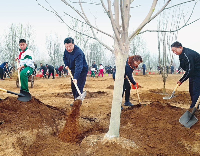 2018年4月2日,党和国家领导人习近平、李克强、栗战书、汪洋、王沪宁、赵乐际、韩正、王岐山等来到北京市通州区张家湾镇参加首都义务植树活动。这是习近平同大家一起植树。新华社记者谢环驰/摄