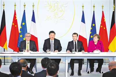 3月26日,国家主席习近平在巴黎同法国总统马克龙一道出席中法全球治理论坛闭幕式。德国总理默克尔、欧盟委员会主席容克应邀出席。新华社记者 鞠 鹏摄