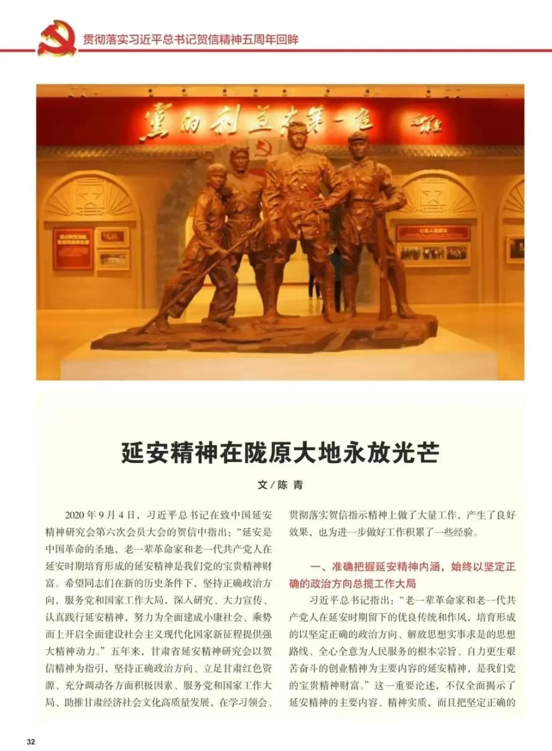 2020年9月4日习近平总书记在致中国延安精神研究会第六次会员大会的贺信中指出:“延安是中国革命的圣地,老一辈革命家和老一代共产党人在延安时期培育形成的延安精神是我们党的宝贵精神财富。希望同志们在新的历史条件下,坚持正确政治方向,服务党和国家工作大局,深入研究、大力宣传、认真践行延安精神,努力为全面建成小康社会、乘势而上开启全面建设社会主义现代化国家新征程提供强大精神动力。”五年来,甘肃省延安精神研究会以贺信精神为指引,坚持正确政治方向、立足甘肃红色资源、充分调动各方面积极因素、服务党和国家工作大局、助推甘肃经济社会文化高质量发展,在学习领会、贯彻落实贺信指示精神上做了大量工作,产生了良好效果,也为进一步做好工作积累了一些经验。