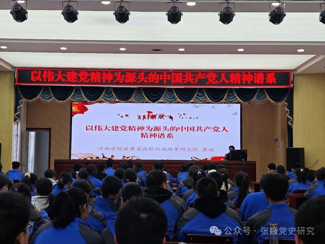 在高台一中的活动现场,延安精神研究会理事、河西学院蒋超教授做了“赓续红色血脉·培育一代新人”的主题宣讲。用生动的语言、翔实的事例,深入浅出地阐释了以伟大建党精神为源头的中国共产党人精神谱系,激励青年学子激扬青春、放飞梦想、筑梦新时代,努力成长为担当民族复兴大任的时代新人。